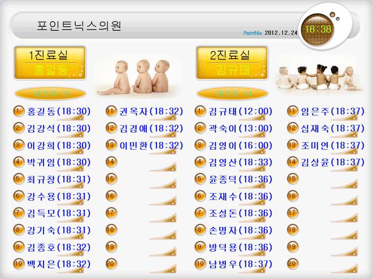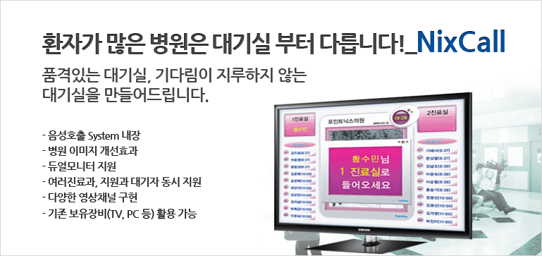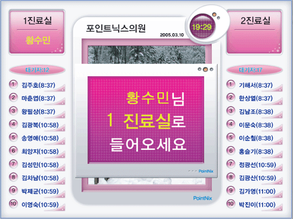 - - 대기자 이름, 진료실 명칭 등을 음성으로 호출해주는 시스템을 내장하고 있어 환자를 직접 부르지 않아도 되는 편리한 기능입니다.
