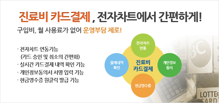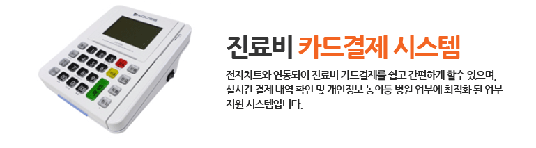 - 단말기에 별도의 입력이 필요 없으며, 발생된 진료비를 전자차트에서 원클릭으로 결제가 가능합니다.