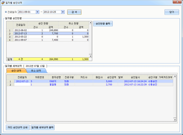 - 카드 결제시 승인 및 취소 내역을 실시간으로 환자별, 일자별, 월별로 간편하게 확인할 수 있습니다.